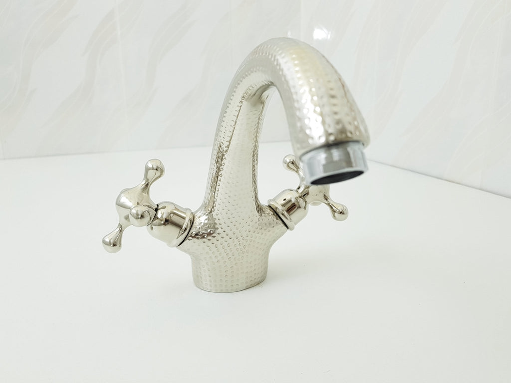 Handcrafted Nickel Finish faucet for an aging vintage look. Made in Marrakech by passionate and professionals craftsmen , this is your chance to decorate your bathroom with high quality , this silver faucet will be the brighten jewelry of your bathroom , order yours now and complete the elegant of your home decor , it is suitable for you contemporary house . you could install it in your bath sink or in your entryway sink ,it has a wonderful view wherever yo install it.