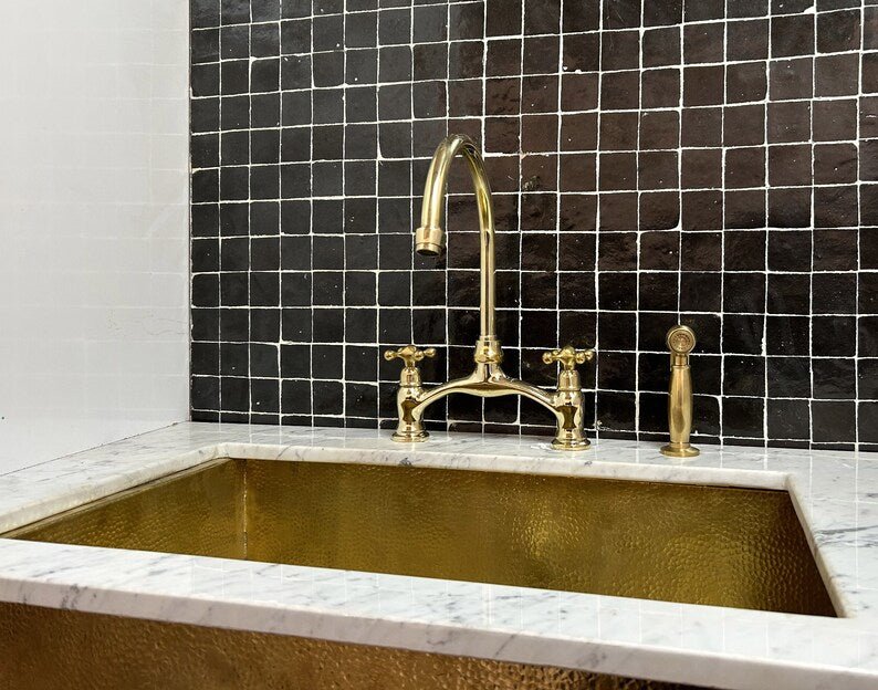 Unlacquered Brass Bridge Faucet with Sprayer and Cold Faucet, Kitchen Spout, Brass Kitchen Faucet, Sink Faucet, Curved Bridge Faucet Brass