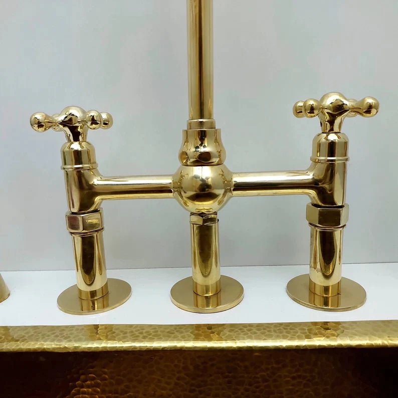 ❖ An unlacquered brass bridge kitchen faucet is a traditional style faucet with two handles and a bridge connecting the hot and cold water supply. It is made of solid brass that is untreated, allowing it to age naturally and develop a unique patina over time.